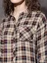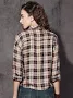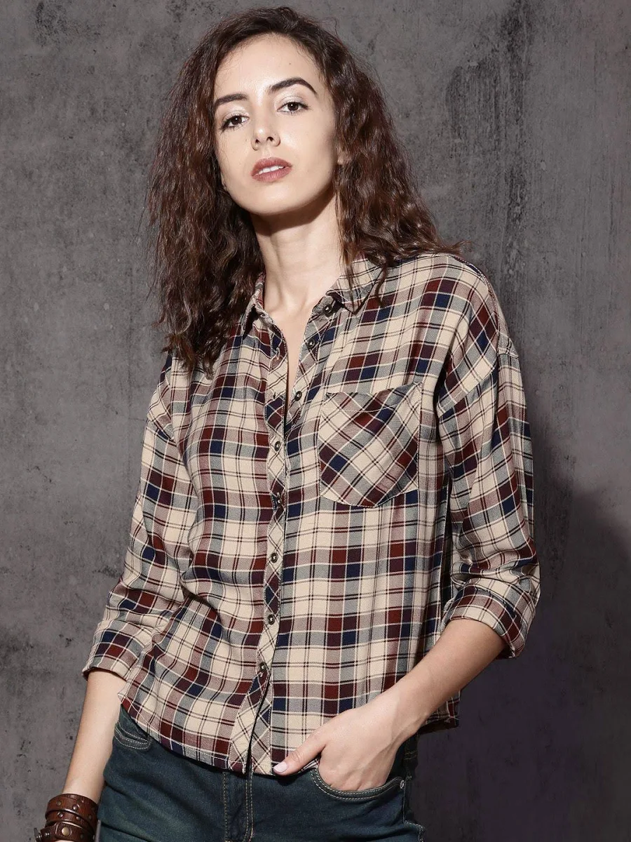 Beige and maroon checked casual shirt, has a spread collar, button placket, 1 pocket, long sleeves, curved hem
