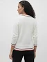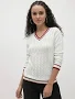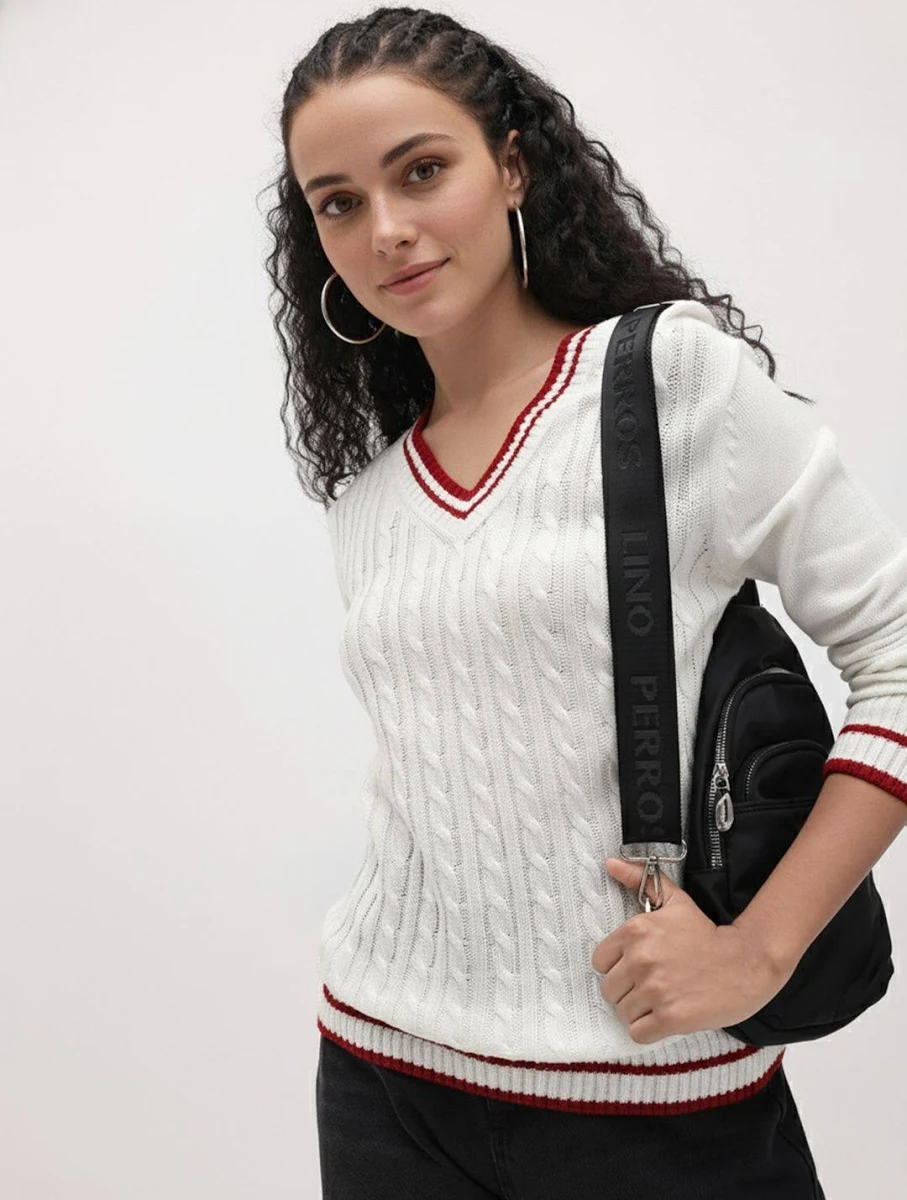 White cable knit pullover, has a V-neck with contrast striped, long sleeves, ribbed hem